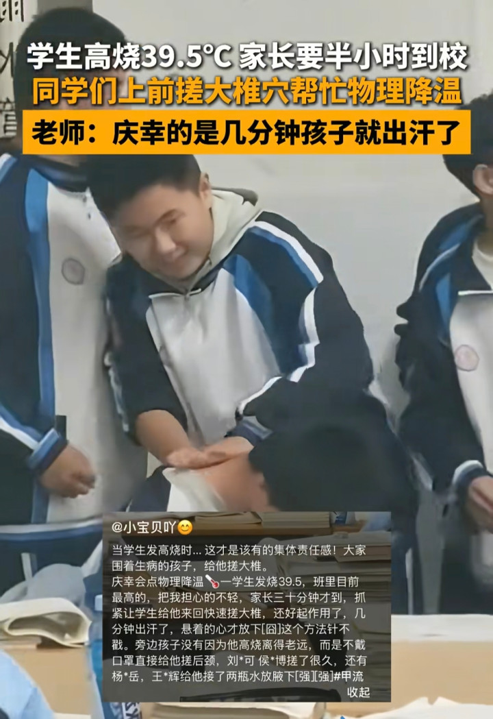 校医室的路不远,老师正想喊个学生陪着去。三个男生突然围上来。最前面那个,校服袖口卷着,露出细瘦的胳膊。“老师,我奶说搓大椎穴能退烧!”他声音有点急,手已经往男孩后颈探。